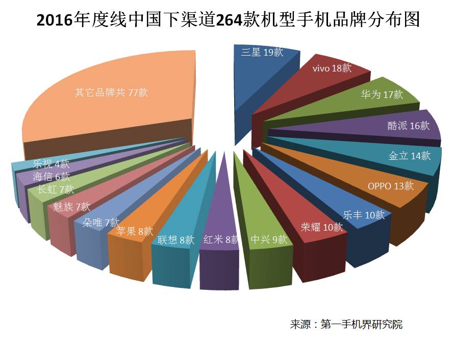 2016年度在中国大陆线下渠道走量的264款手机机型基本分布是,三星19款、vivo18款、华为17款、酷派16款、金立14款、OPPO13款、乐丰10款、荣耀10款、中兴9款、红米8款、联想8款、苹果8款、朵唯7款、魅族7款、长虹7款、海信6款、乐视4款、其它品牌77款。