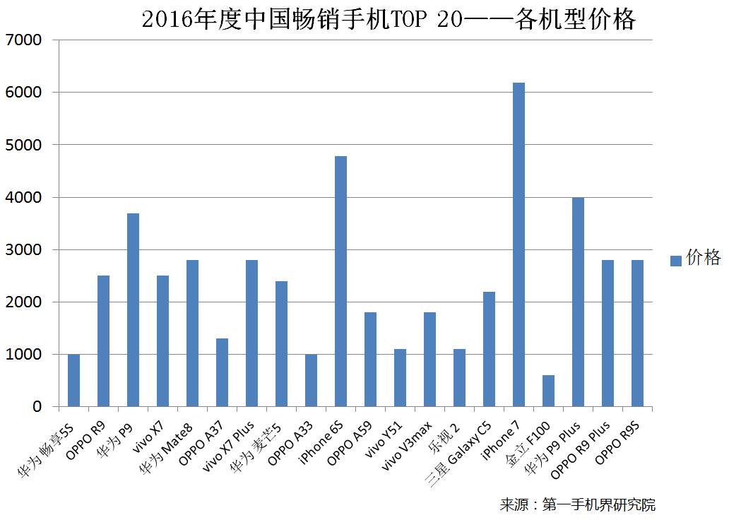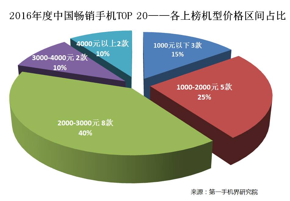 2016年度中国畅销手机TOP 20,超过2000元售价的机型占12款;千元以下的机型占3款。20款畅销手机平均价格为2457元。