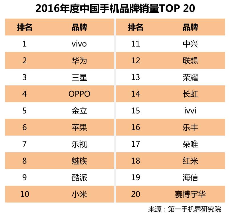 vivo、华为、三星、OPPO、金立、苹果、乐视、魅族、酷派、小米成为2016年度中国手机品牌销量TOP 10。