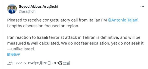 伊朗外长阿巴斯·阿拉格希在社交媒体发文重申,伊朗肯定会对以色列展开报复行动,但行动会经过仔细计算。他强调,伊朗不害怕紧张局势升级,但也不寻求升级。