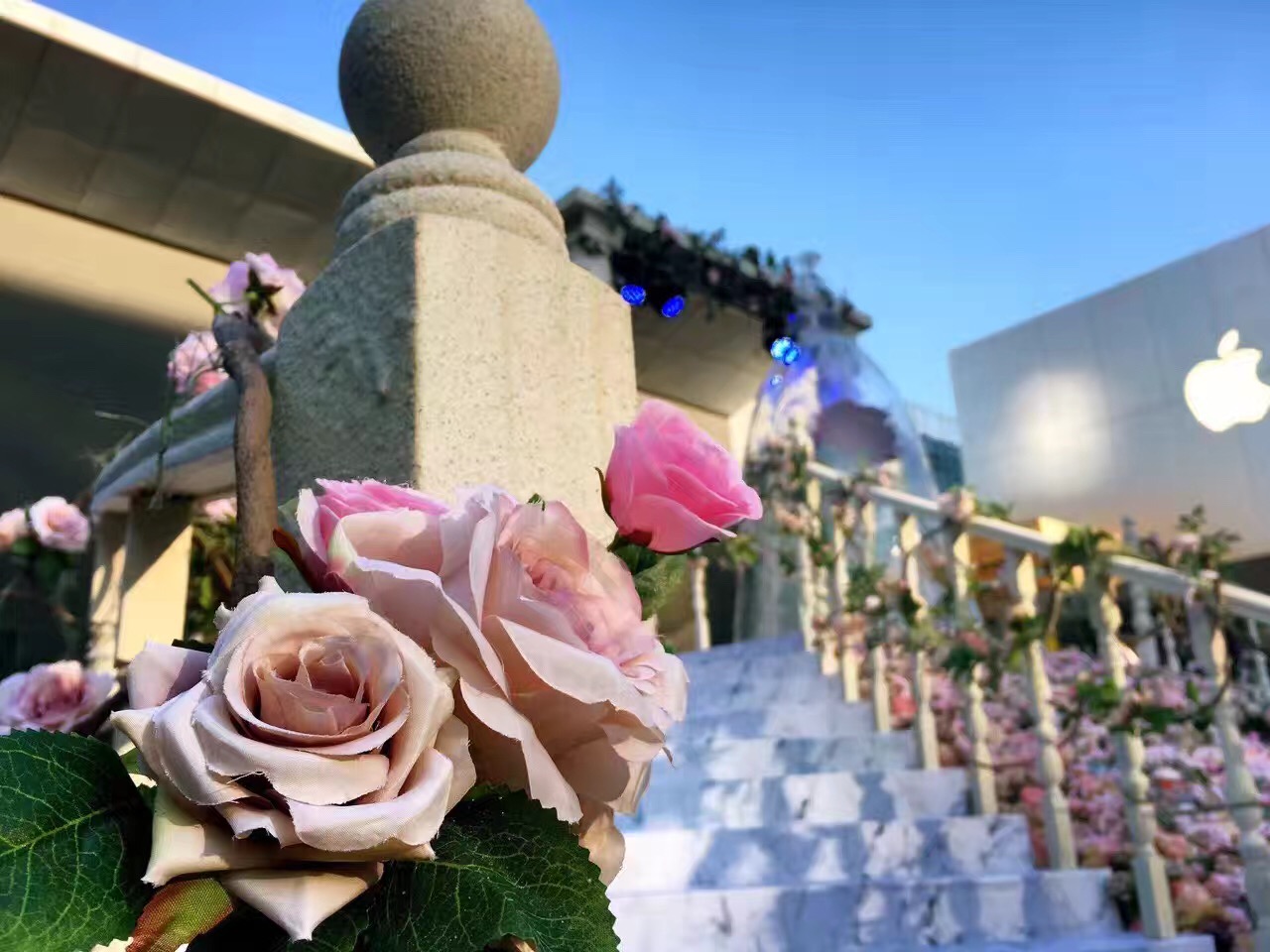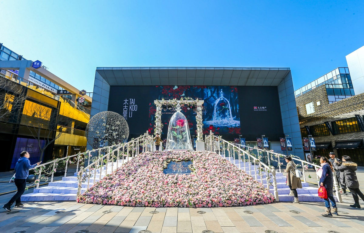 如果你最近来到北京三里屯,大概会被眼前这个奇妙的景观吸引:一个巨大的玻璃钟罩玫瑰花被安置在太古里南区的广场上,被粉色的花海簇拥,就连两侧的白色楼梯上,也装饰了缠绕的玫瑰花枝。