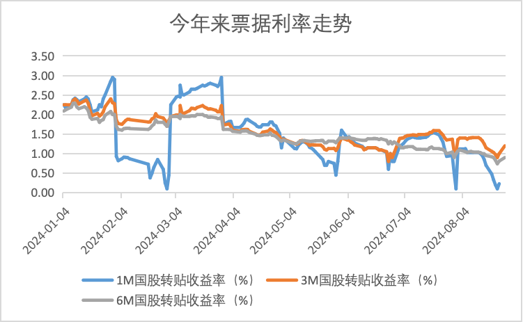 近期票据利率呈现走低的态势。第三方数据显示,上周1个月期、3个月期、6个月期国股行票据转贴收益率全线跌破1%,创下年内新低。其中8月22日1个月期国股行票据转贴收益率低至0.1%。