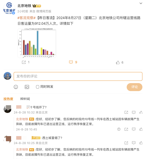 @北京地铁 微博8月28日回复网友评论时表示,经初步了解,相关时段内10号线一列车在西土城站因车辆故障产生异味,目前故障列车已退出运营正线,运行秩序恢复正常。