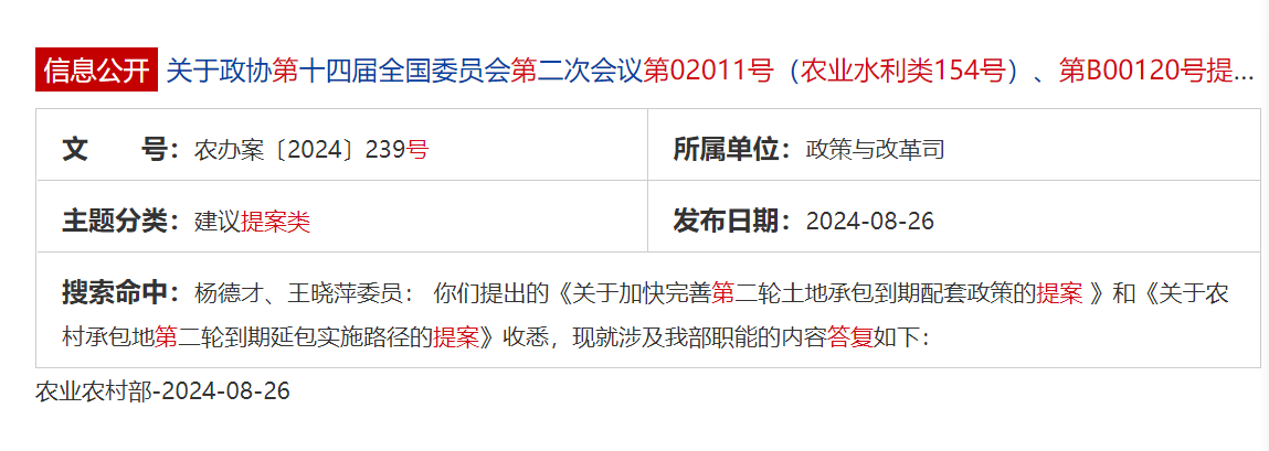 今年全国两会期间,全国政协委员杨德才、王晓萍提出了《关于加快完善第二轮土地承包到期配套政策的提案》和《关于农村承包地第二轮到期延包实施路径的提案》。农业农村部近期对两份提案逐条作出回复。