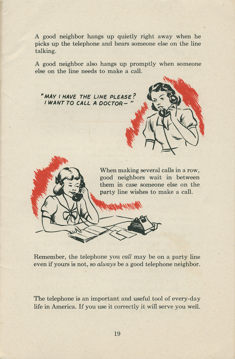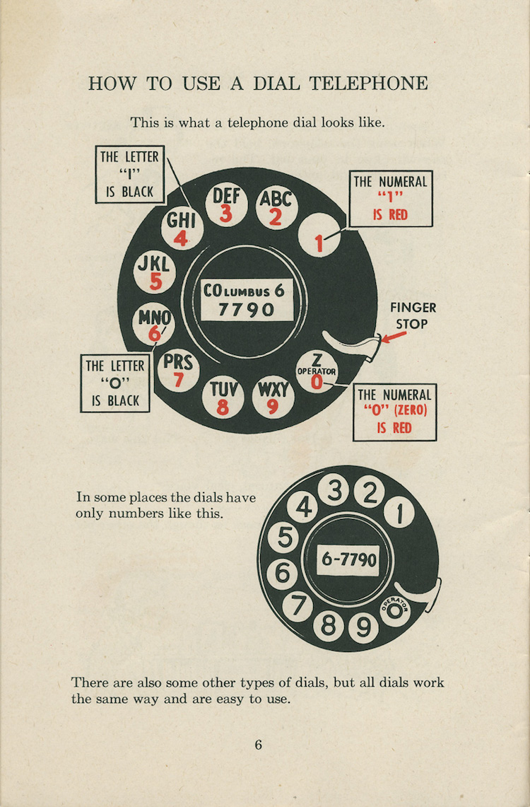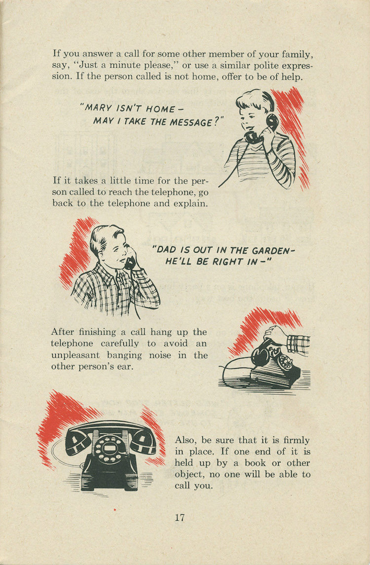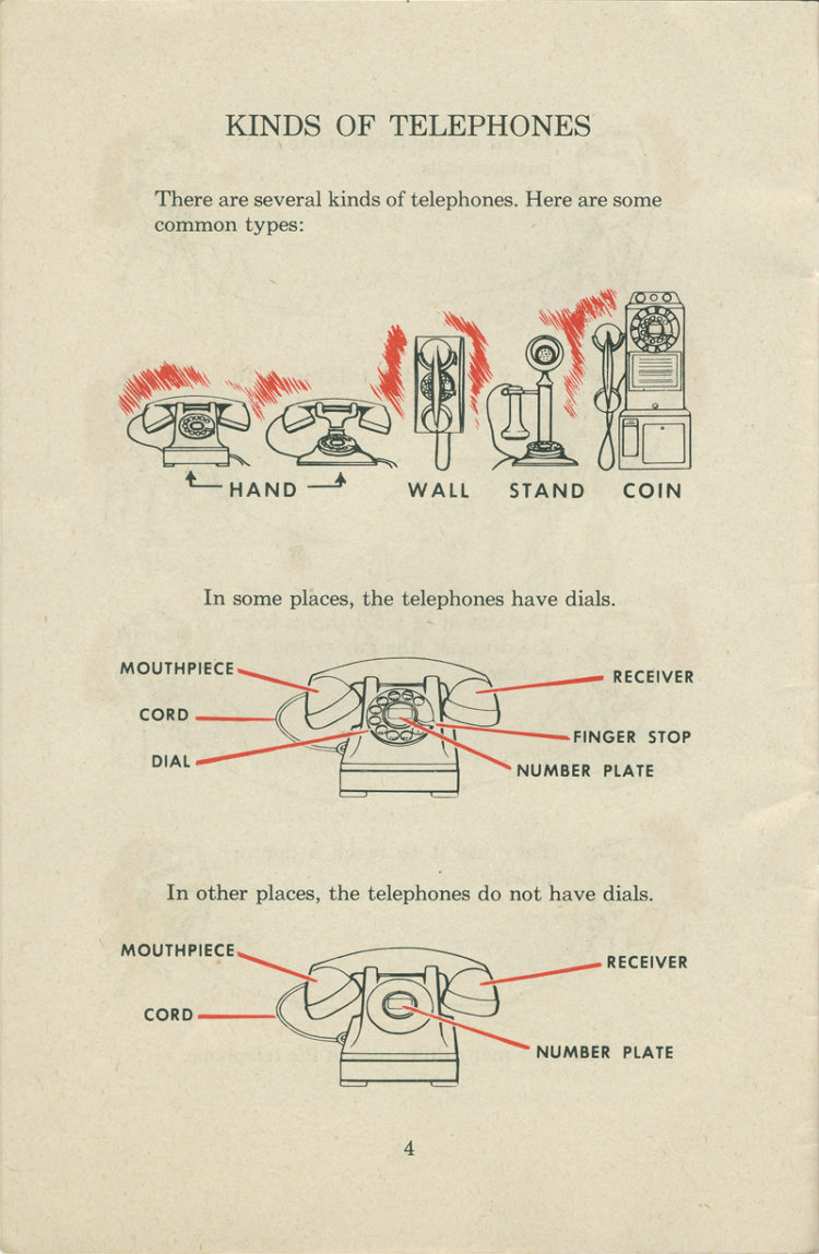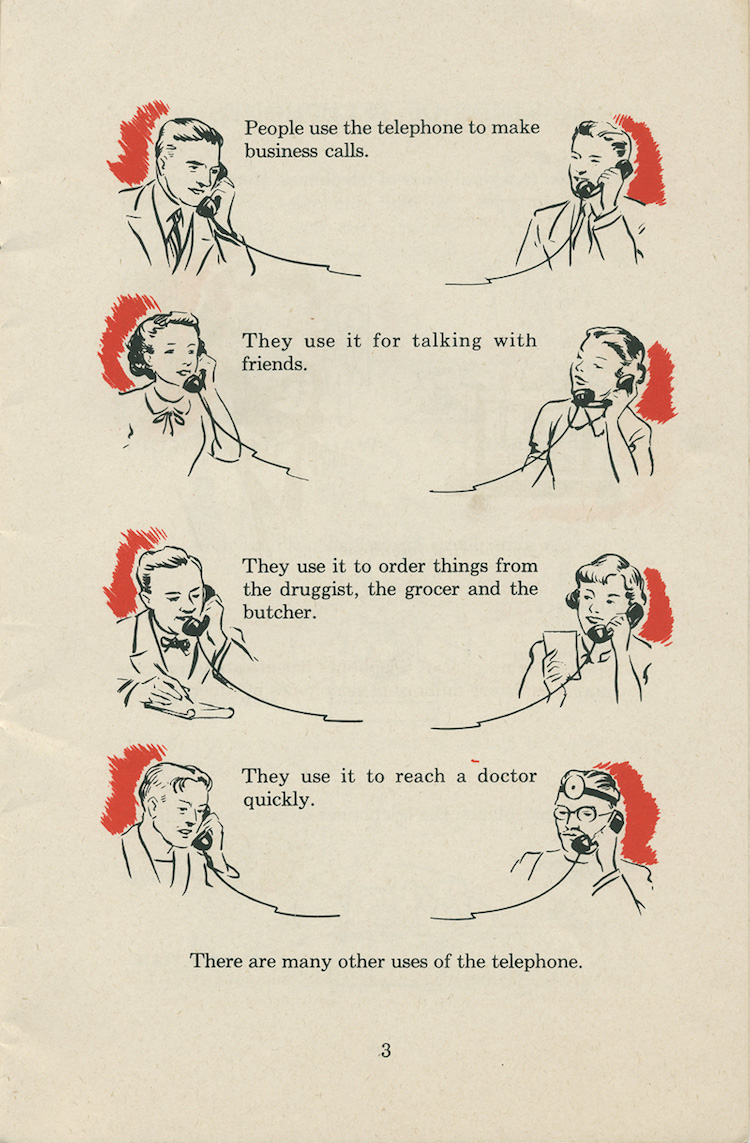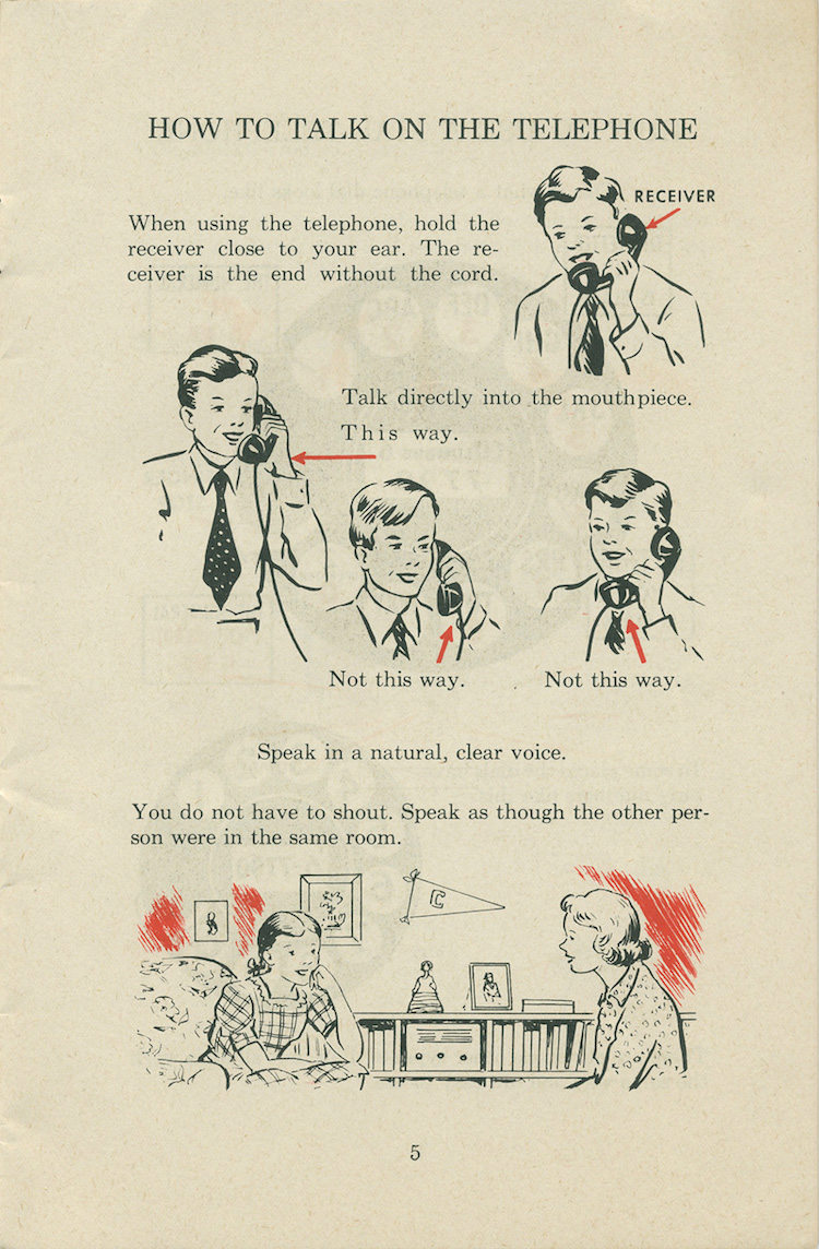 从告诉我们为什么要用电话到介绍常见的电话种类,这本小册子让我们想起过去的时代。小册子主要针对盘式电话,这种电话1980年代前就基本被淘汰了。不知道应该怎么拿听筒?手册告诉你。不知道应该如何有礼貌地电话留言?小册子给你举了几例。