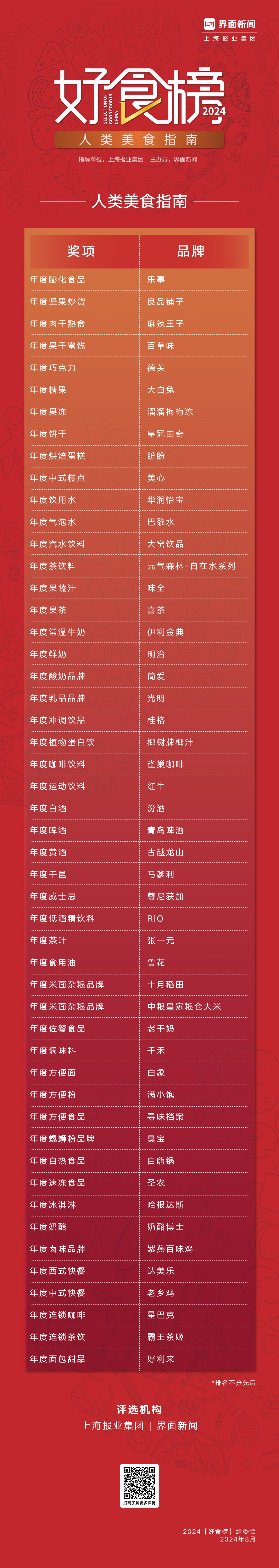 在此背景下,由上海报业集团 | 界面新闻发起的2024【好食榜】评选再度出发。携手咨询机构和行业专家学者,同时聆听更多消费者的意见与建议,通过榜单形式表彰优秀食品品牌,致敬他们在新消费生态下,坚守食品品质之余在积极创新、推动行业新趋势方面做出的卓越贡献。