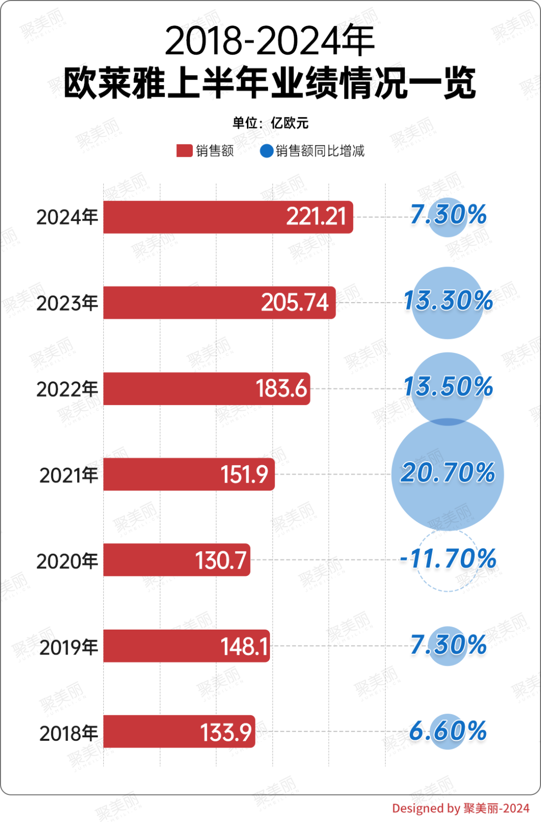 但追溯欧莱雅近年上半年业绩可以发现,虽然销售额持续新高,增速可见明显放缓,今年上半年已由最高超20%的双位数增长下滑至个位数。