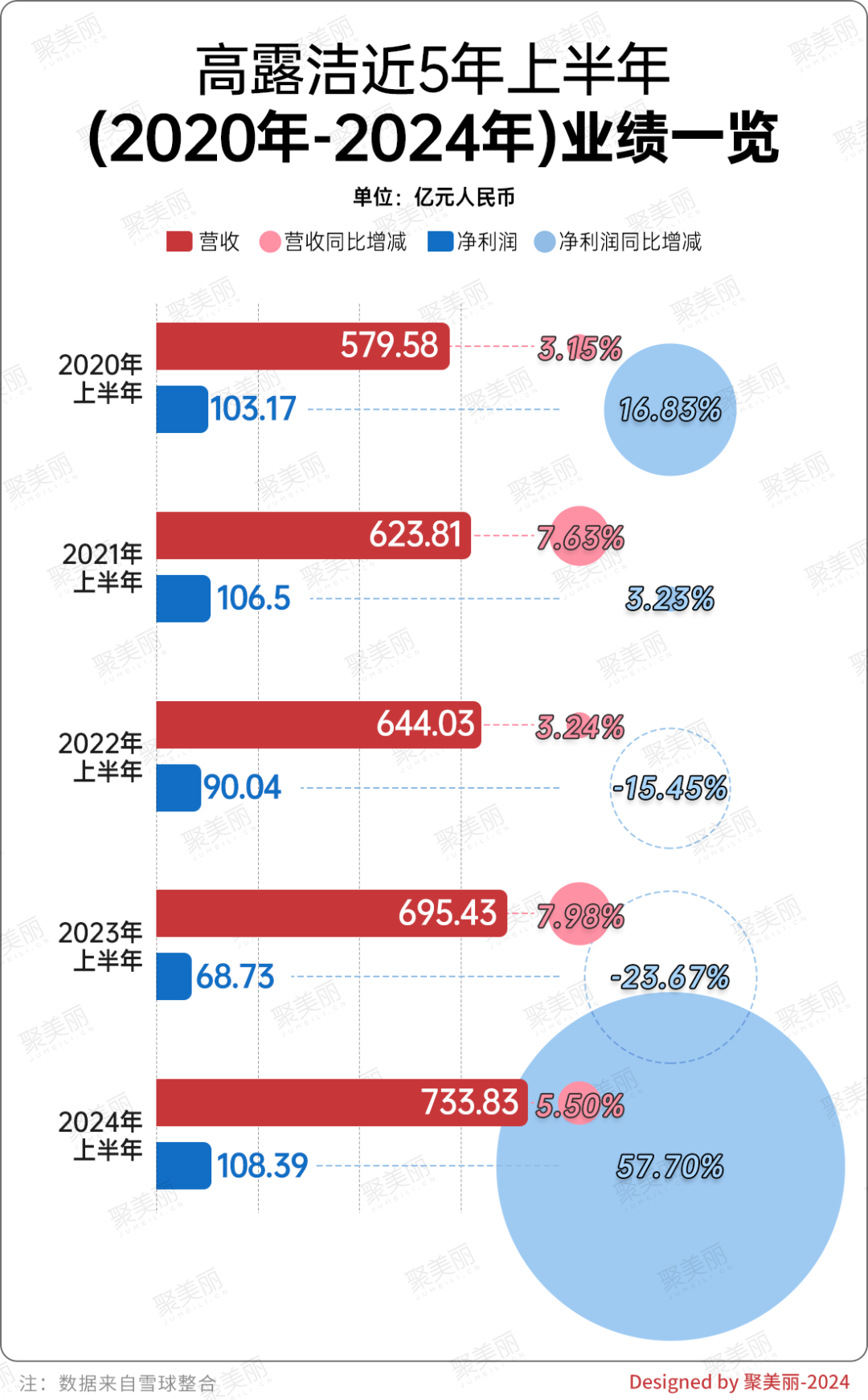 以2020-2024年上半年的业绩来看,在2022年上半年高露洁就已出现增收不增利,去年上半年增收不增利的情况也还在加剧。但今年上半年高露洁却以超50%的增速实现了营收净利润双增长。
