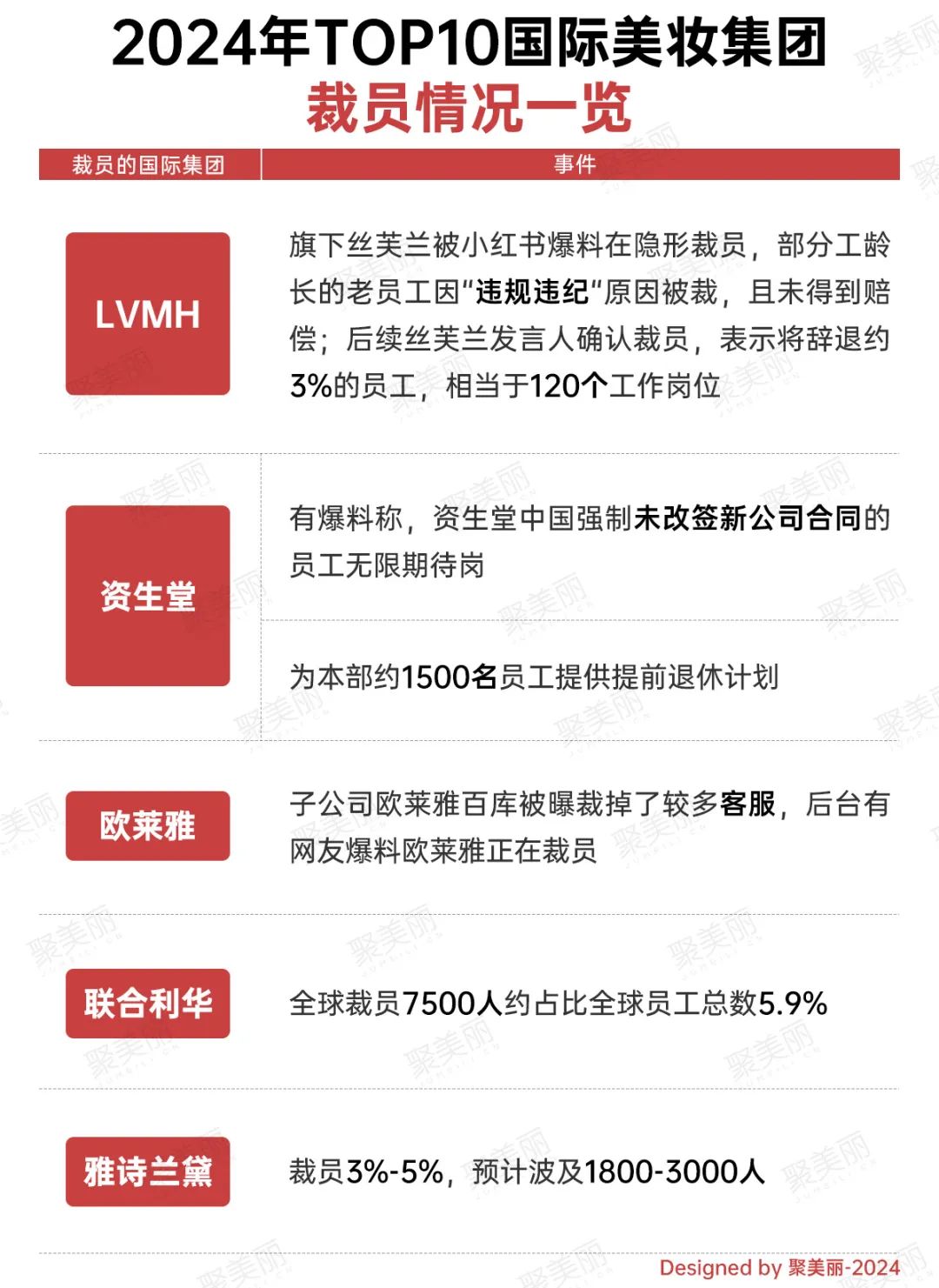 据聚美丽不完全统计,今年以来TOP10国际美妆集团中已有一半被曝裁员。