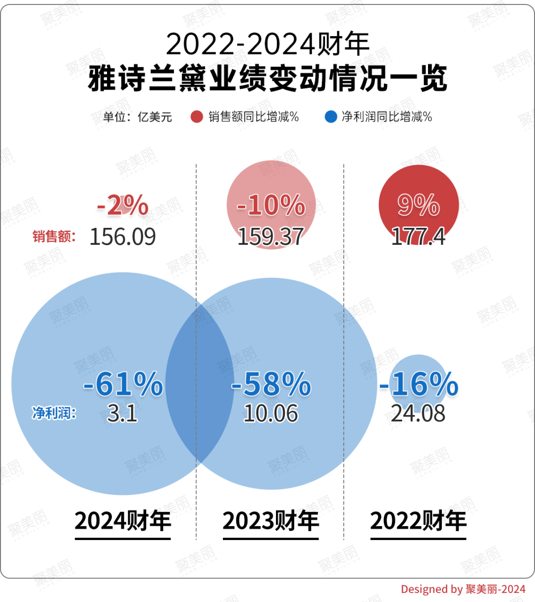 据聚美丽不完全统计,截止2024财年,雅诗兰黛已出现连续2个财年销售额下滑,连续3个财年净利润下滑。其中,虽然今年上半年雅诗兰黛销售额以6.1%的增速重回增长,但其净利润的下滑幅度一路走高,2024财年继续扩大到了61%。