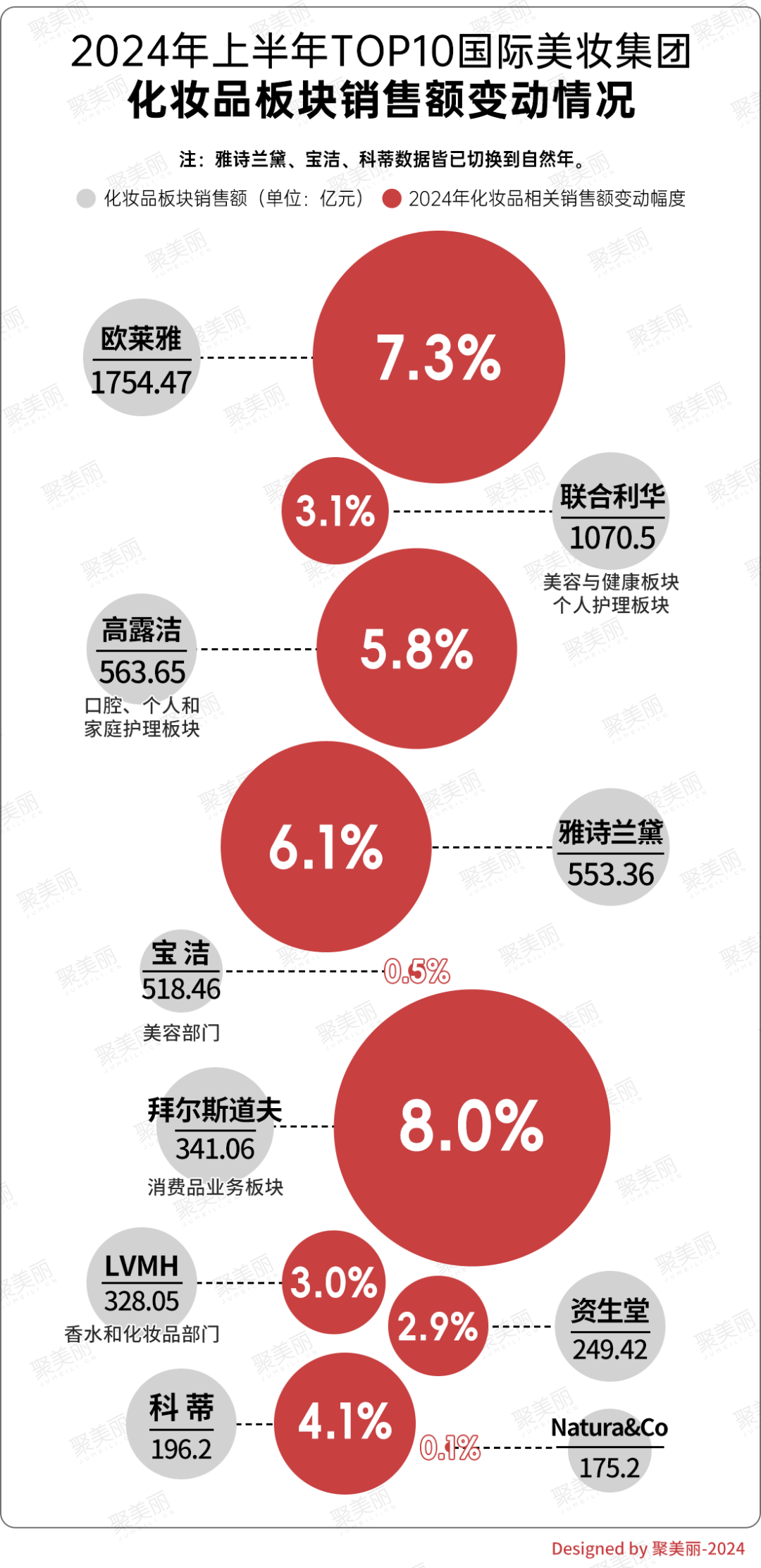 我们把目光聚焦到今年上半年的各家成绩,剥离非化妆品板块后,TOP10国际美妆集团今年以来虽一直传出负面消息,但作为头部,其在销售额上还是统一保持着增长的。