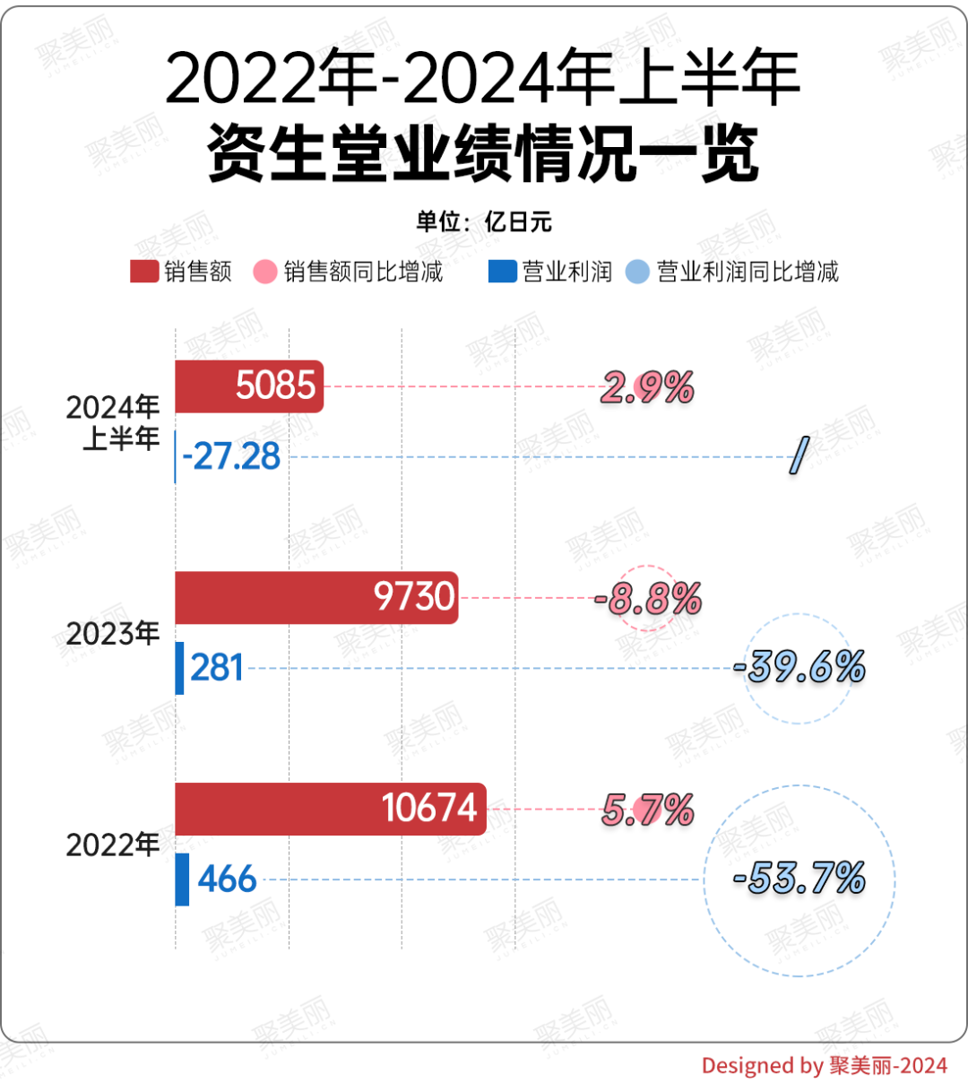 资生堂今年上半年虽然销售额重回增长,但营业利润已由下滑状态变成亏损27.28亿日元。而这种亏损是可从往年财报中预见的。据财报显示,早在2022年资生堂的营业利润就已出现超5成下滑,2023年下滑幅度虽有收缩但仍未停止。