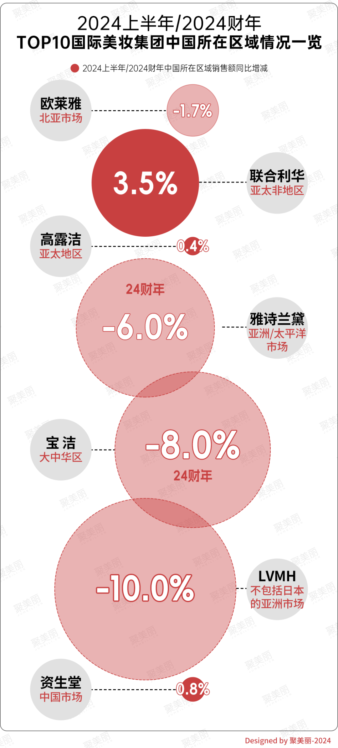 就TOP10国际美妆集团中,具体披露中国所在市场数据的有7家。其中,欧莱雅、雅诗兰黛、宝洁、LVMH中国所在区域销售额已呈负增长,最高降幅达10%。