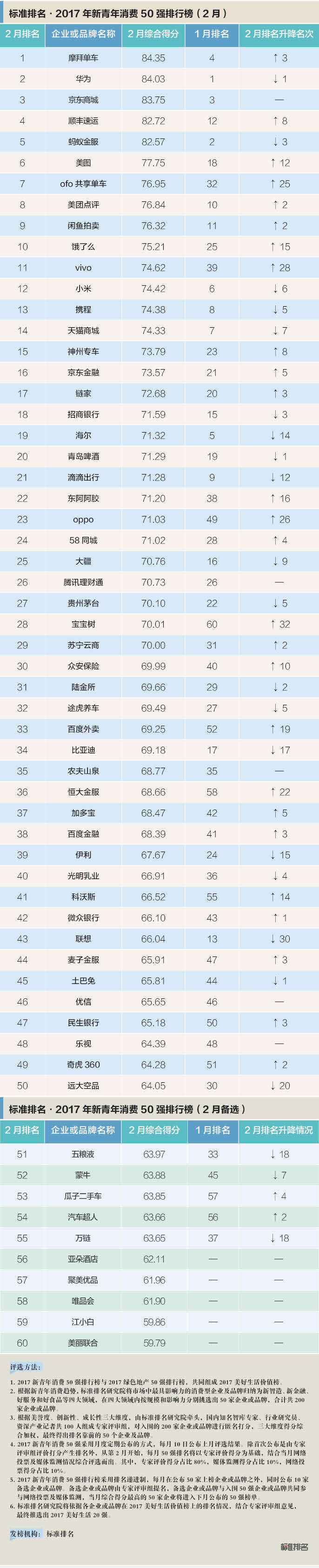2017新青年消费50强每月10日发布上月排名。每月在50家入围企业或品牌之外,标准排名研究院还会列出10家备选企业或品牌,参与网络投票和专家评审。1月份的10家备选企业或品牌中,排名第60位的宝宝树成功逆袭。除宝宝树外,备选企业或品牌进入50强榜单的还有百度外卖(2月排名33位)、恒大金服(2月排名36位)、科沃斯(2月排名排名41位)和奇虎360(2月排名排名49位)等。