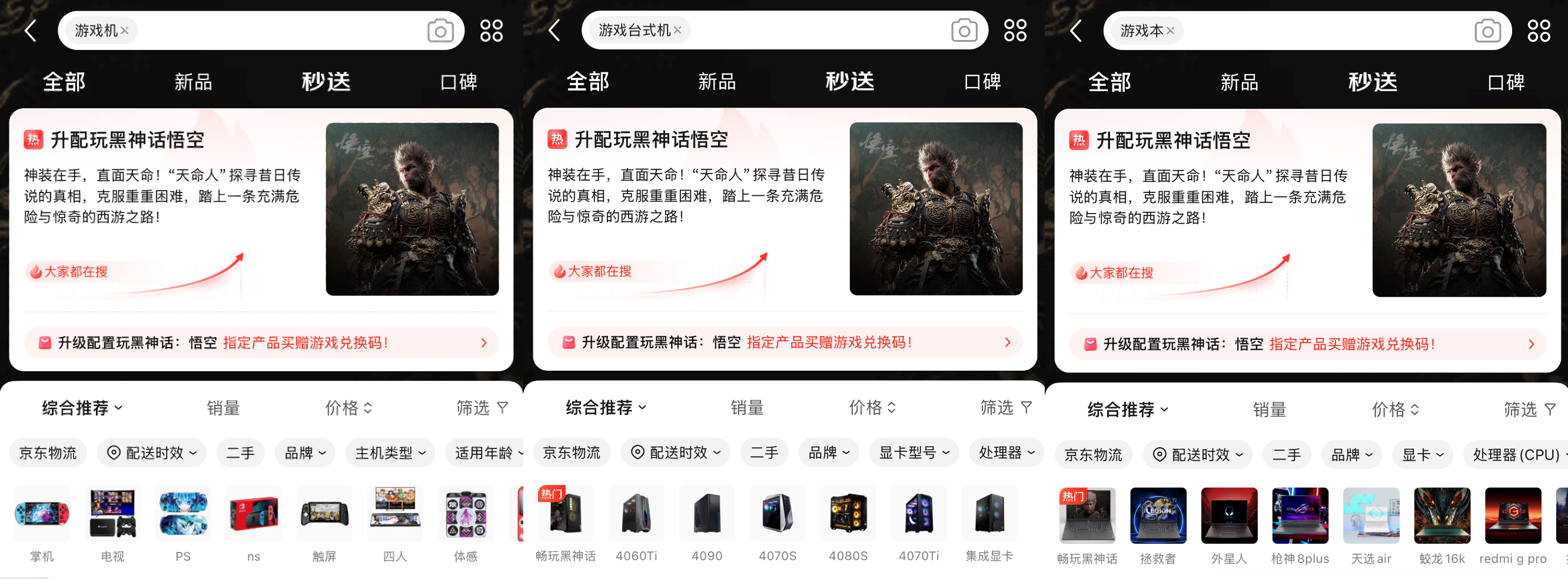 玩游戏同样需要更好的装备。在游戏的主题页面,京东还为玩家们精心制作了“保姆级”装备推荐,覆盖显卡、游戏台式机、游戏本、游戏机及游戏周边设备,在京东APP搜索“黑神话悟空”、“游戏本”、“游戏台式机”等对应关键词即可选择需要升级的硬件设备,这一做法也有效引爆了一波相关产品的销售。