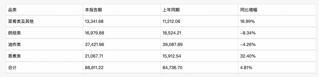 除烘焙类在报告期内同比减少外,油炸类销售也出现了下滑,报告期内实现营业收入3.74亿元,同比减少4.26%。