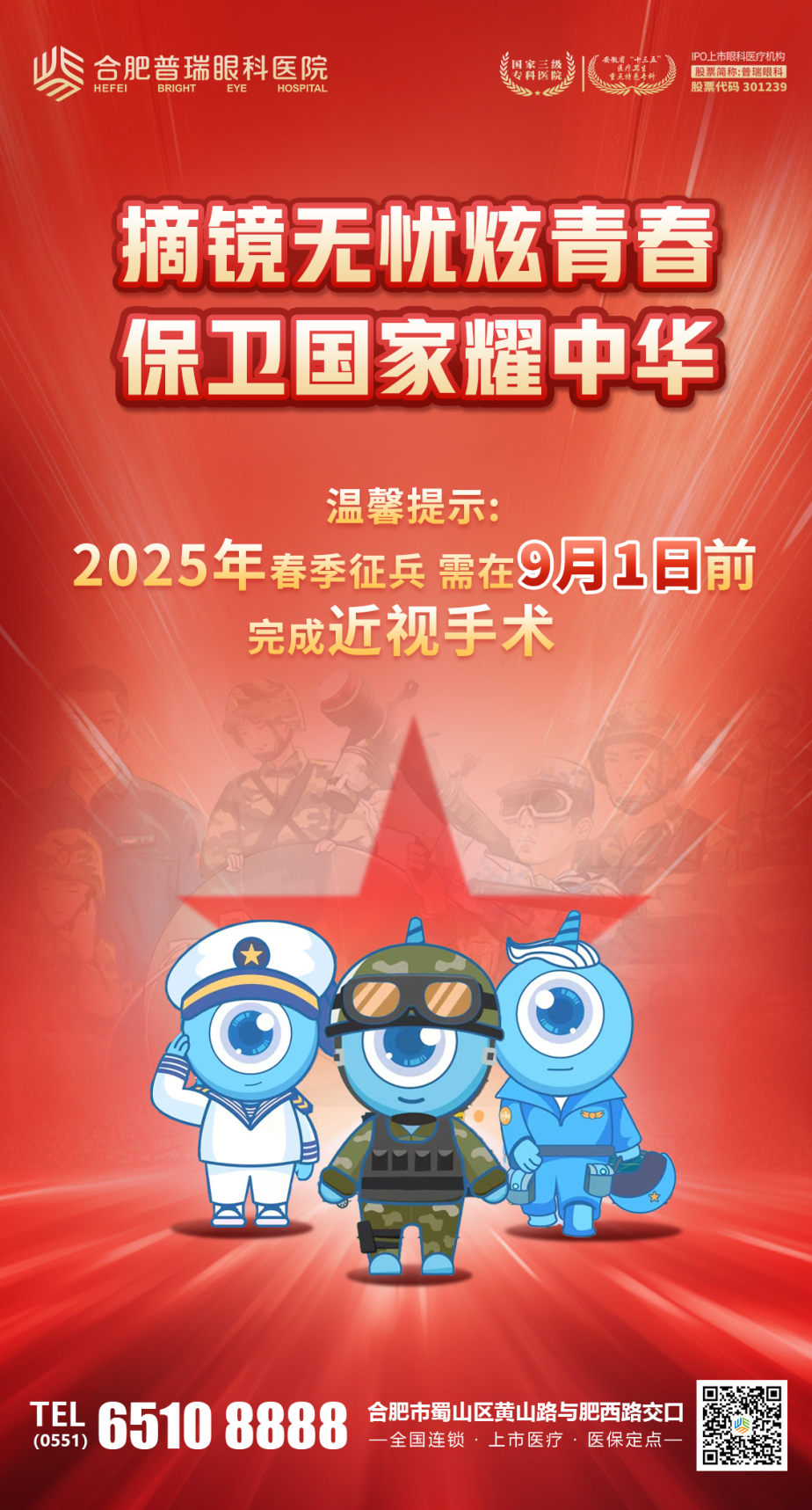 无论是上半年还是下半年应征,都可以提前到专业医院进行视力检查和近视手术预约,以便及时发现问题,有针对性地进行调整治疗,做到未雨绸缪,避免因为视力问题而无缘军旅梦。