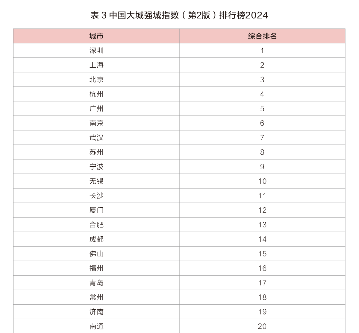 “中国大城强城指数(第2版)”排名前10位的城市是,深圳、上海、北京、杭州、广州、南京、武汉、苏州、宁波、无锡。深圳从上一轮排名第3跃居第1,上海、北京上一轮排名并列第1,这次分别位列第2和第3。陈宪指出,排名的变化既显示了深圳近年来的发展,也表明了这一指数对经济的侧重。“GDP的表现固然重要,但我们也兼顾了环境和民生等指标。”