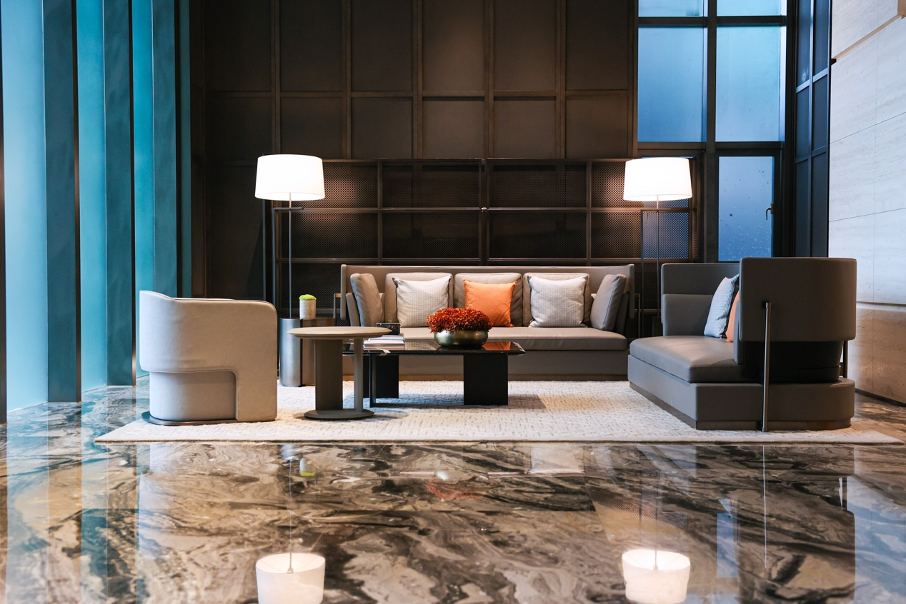 地上地下双大堂,对标高端酒店呈现全新升级。一湾臻邸聘请大师执笔,引入威尼斯棕大理石地面、意大利超白洞石材、胡桃木木饰面等,打造高定艺术大堂,美感与功能共存,尊崇感与仪式感并蓄。
