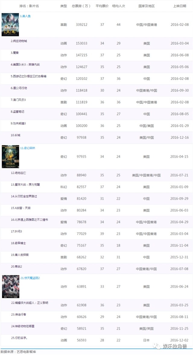 去年,在年初春节档七天创造了30.4302亿的惊人票房成绩后,业内人士就预测2016年最终的全年票房将达到600亿的史上新高。当11月13日票房才刚刚突破400亿时,也就注定了去年将是内地电影市场“梦醒”的一年,纵观去年票房前25名的影片,国产片和引进片各占一半,成绩最好的是《美人鱼》33.9212亿,排在末位的是《你的名字》5.6593亿,并且这25部影片由超过一半是在上半年公映的。