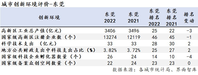整体上看,东莞的创新环境在科技支出等指标上有所改善,但在高新区工业产出及科技企业孵化等方面仍有待提升。