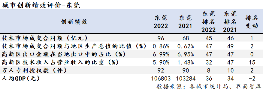 在创新绩效方面,东莞的得分为63.18,排名第32位,较上年上升10位。