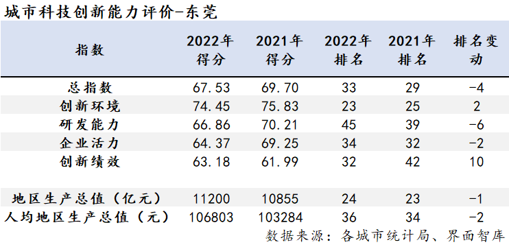 在《中国区域科技创新能力评价指数报告(2023)》“城市篇”中,界面智库从创新环境、研发能力、企业活力和创新绩效四个维度对国内GDP超过5000亿的55个城市进行了科技创新能力的评估。结果显示,科技创新能力10强城市依次为北京、深圳、上海、苏州、武汉、杭州、合肥、南京、广州和西安。作为珠三角地区的重要城市和经济重镇,东莞的科技创新能力总指数为67.53,排名位于第33位,较上一年下滑4位。