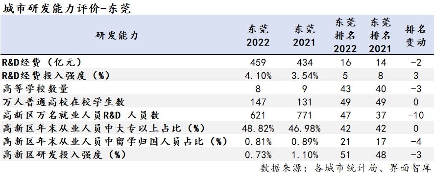 在研发能力方面,东莞的得分为66.86,排名第45位,较上年大幅下滑6位。