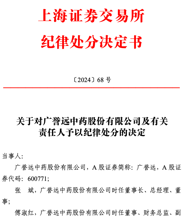 公告显示,证监会对广誉远给予警告,并处以800万元罚款,对时任董事长、总经理、董事张斌给予警告,并处以500万元罚款。