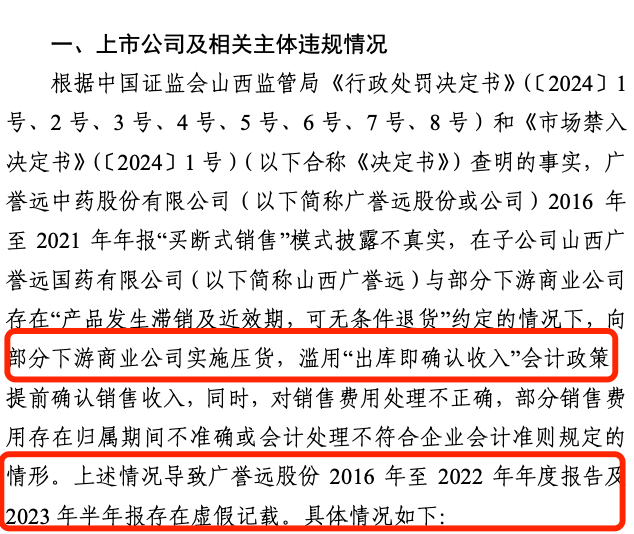 今年4月16日,上交所披露纪律处分决定书。公告显示,广誉远在2016年-2021年财报中,“买断式销售”模式披露不真实。