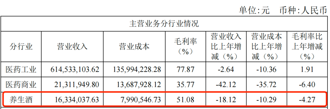 只不过,2024年上半年,广誉远养生酒产品的销售表现并不如意。财报显示,公司养生酒实现营业收入1633.40万元,营业收入比上年减少18.12%,毛利率也减少4.27%。