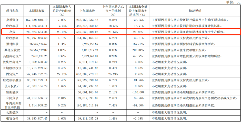 2024年上半年,公司存货高达6.94亿元,占总资产比例为29.07%,较上年期末增长了21.82%。此外,公司的货币资金也比上年期末的2.59亿元减少了35.25%,下滑至1.68亿元。