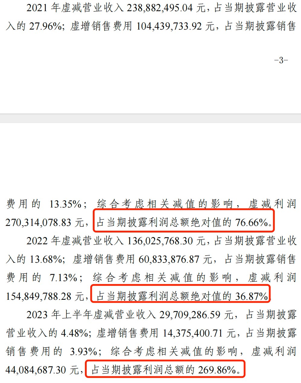 此外,2021年和2022年,广誉远分别虚减当期利润总额绝对值的76.66%、36.87%。2023年上半年公司更是虚减了269.86%的利润。