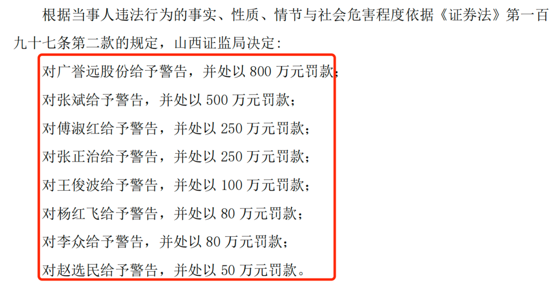 此外,证监会对广誉远时任各个责任人都给予警告处分,并处以不同金额的罚款。