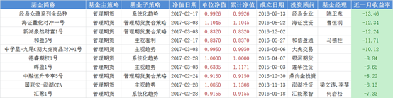 2月排行垫底的10只管理期货型私募产品,月度亏损幅度超过10%的产品有五只。其中,“经易众盈系列全品种”本月净值折损近13.46%,“海证量化对冲一号”,“新湖泉然财富1号”,紧随其后,分别亏损12.34%,12.24%。