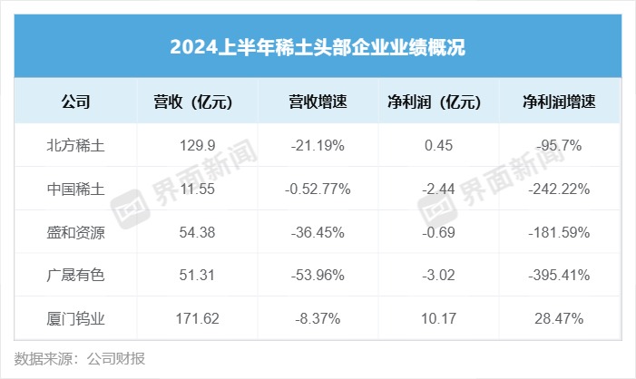 据界面不完全统计,中国稀土(000831.SZ)、北方稀土(600111.SH)、盛和资源(600392.SH)、厦门钨业(600549.SH)、广晟有色(600259.SH)在内的五家头部企业中,只有厦门钨业实现净利增长,其余四家公司均出现显著下降,其中北方稀土净利降幅超九成,另三家陷入亏损。