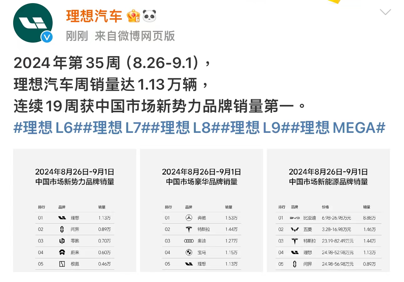 理想汽车9月3日在微博宣布,2024年第35周(8.26-9.1),理想汽车周销量达1.13万辆。