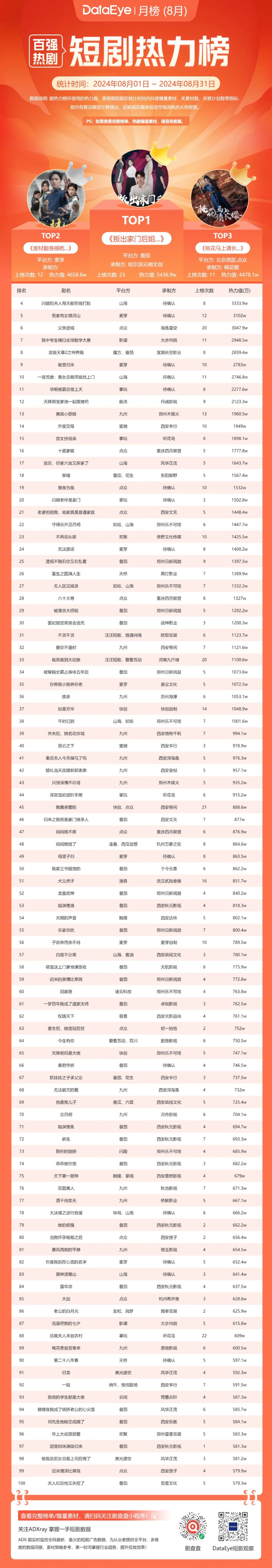 一、8月DataEye短剧热力榜:大盘消耗23亿,32部新剧闯入TOP40
