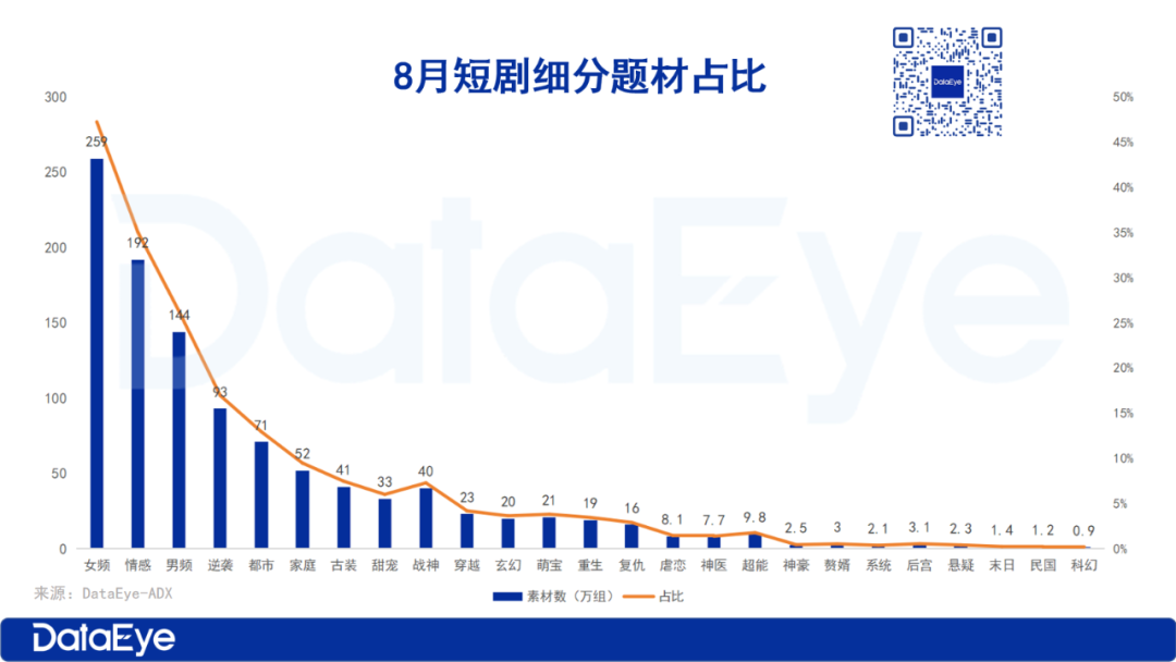 三、8月短剧热投题材:整体素材量上涨,女频占比近50%