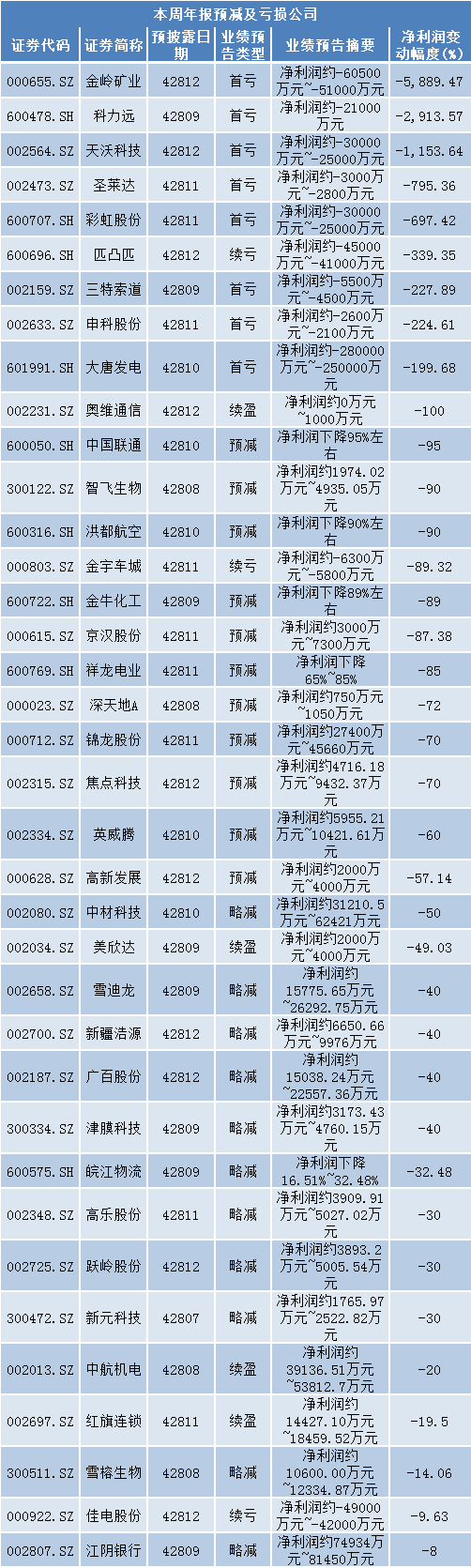 同时,金岭矿业(000655.SZ)、科力远(600478.SH)、天沃科技(002564.SZ)、圣莱达(002473.SZ)、彩虹股份(600707.SH)、三特索道(002159.SZ)、申科股份(002633.SZ)和大唐发电(601991.SH)预告业绩首亏。匹凸匹(600696.SH)、金宇车城(000803.SZ)和佳电股份(000922.SZ)三家公司2016年出现续亏,待年报出毕,公司将被“戴帽”,以实施退市风险警示。