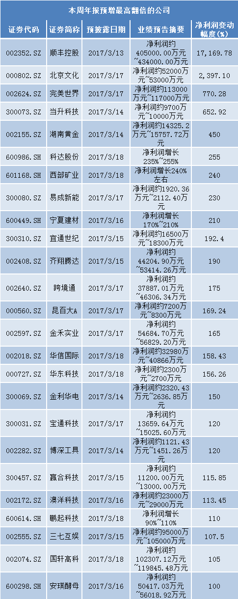 剔除扭亏因素,本周预计2016年归属于母公司净利润增长超过10倍的公司还有北京文化(000802.SZ)。公司预计2016年归属于母公司净利润为5.2亿元-5.3亿元,同比增长23.5-24倍。一方面是因为公司完成了影视文化板块的并购,合并报表增加了世纪伙伴和浙江星河,净利润约1.85亿元-1.95亿元;另一方面,还有一笔约3.35亿元处置灵山景区和龙泉宾馆等资产的非经常性损益。尽管非经常性损益占去年业绩过半,但公司由旅游转型至影视文化板块,对主营业务的提振仍有一定成效。