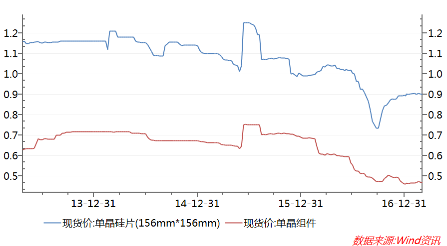 事实上,在2016年,该公司两大主营产品的市场价格较2015年均有所下跌。在单晶硅片方面,隆基股份的单晶硅片尺寸为156mm*156mm,根据Wind资讯提供的数据显示,该尺寸单晶硅片的价格在去年走出了“深V”行情。2016年,该尺寸单晶硅片的平均价格为0.95美元,较2015年下降近14%。2016年9月份,该产品价格一度探底低至0.73美元。而在单晶硅组件方面,该产品2016年的价格整体下滑。其平均价格为0.54美元,同比2015年跌逾20%。