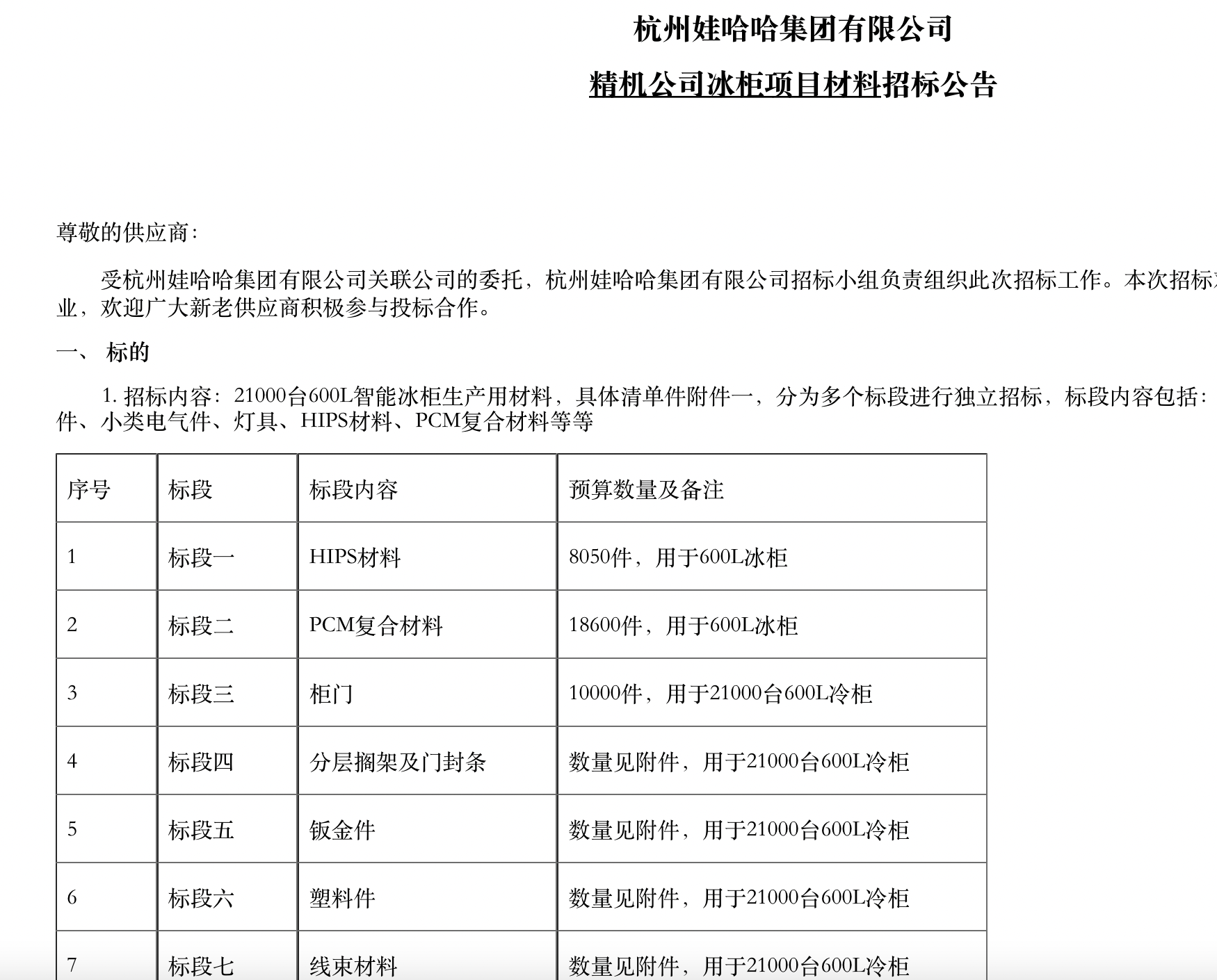 界面新闻浏览了娃哈哈官网招标列表发现,今年3月,娃哈哈曾就“2000台600L中配版冰柜生产用材料”进行过招标;去年12月,娃哈哈同样对21000台600L中配版冰柜生产用材料的需求进行了招标;去年8月,娃哈哈就1000台400L智能冷暖柜和9000台600L智能冰柜生产用材料做了招标。