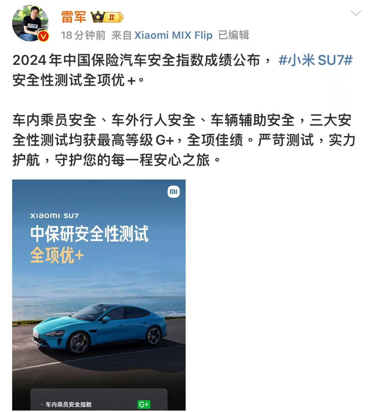 小米创办人、董事长兼CEO雷军9月5日发布微博称,2024年中国保险汽车安全指数成绩公布,小米SU7安全性测试全项优+。车内乘员安全、车外行人安全、车辆辅助安全,三大安全性测试均获最高等级G+。