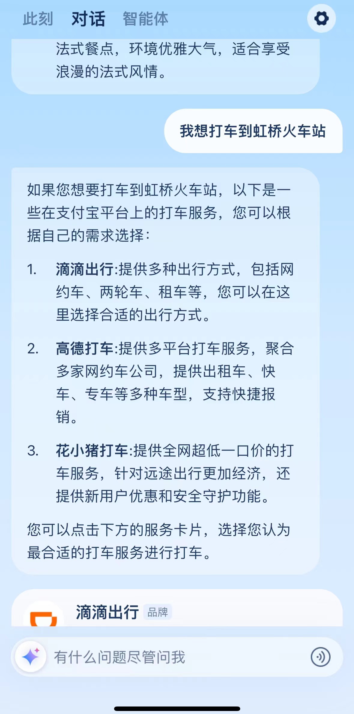 界面新闻体验发现,例如,在支小宝App内发送“我想打车到(某地)”,对话框内会弹出文字建议,之后弹出滴滴等第三方打车软件,点击跳转至App内的小程序。