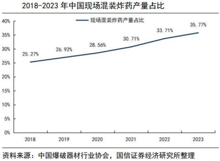 据2018年发布的《工业和信息化部关于推进民爆行业高质量发展的意见》,民爆企业现场混装炸药产能占比应当达到30%,不足30%的将核减差额部分50%的包装炸药许可产能。