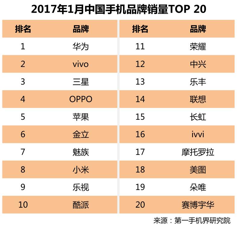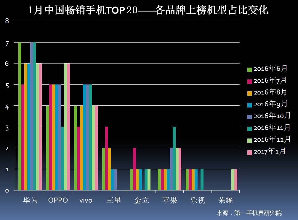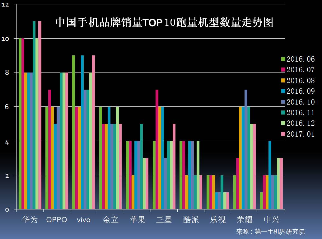 华为、vivo、三星、OPPO、苹果、金立、魅族、小米、乐视、酷派成为1月中国手机品牌销量TOP 10。