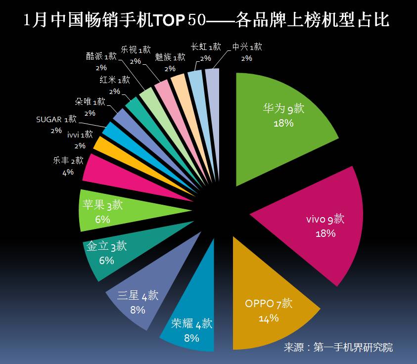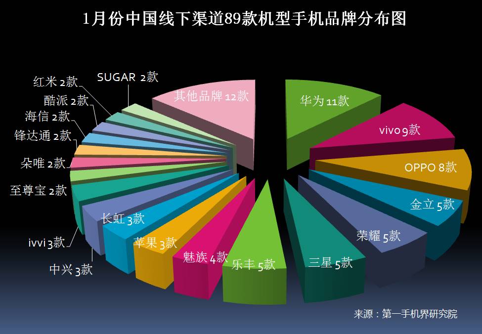 1月在中国大陆线下渠道走量的89款手机机型基本分布是,华为11款、vivo 9款、OPPO 8款、金立5款、荣耀5款、三星5款、乐丰5款、魅族4款、苹果3款、中兴3款、长虹3款、酷派2款、锋达通2款、sugar2款、朵唯2款、红米2款、海信2款、至尊宝2款。