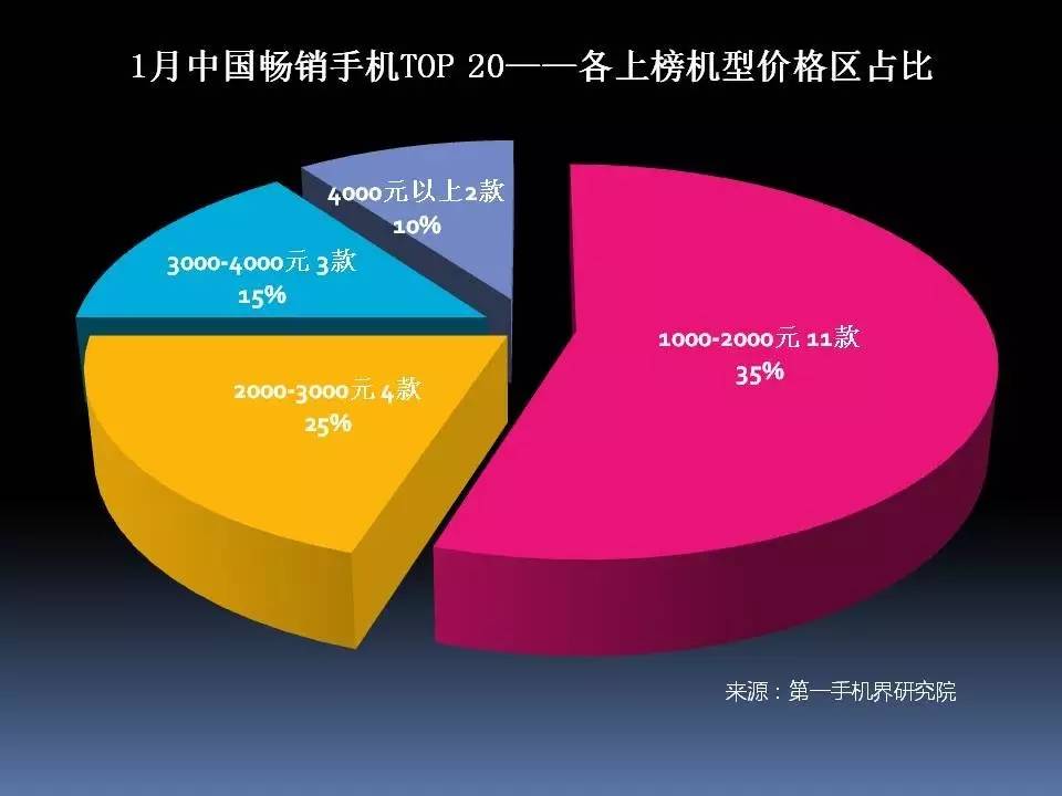1月中国畅销手机TOP 20,超过2000元售价的机型占9款,相比12月减少1款;有意思的是,1月中国畅销手机TOP20已无千元以下的机型。