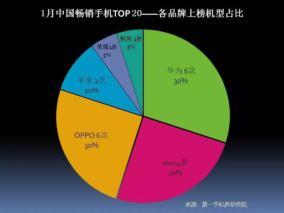 1月中国畅销手机TOP 20中,华为有6款、OPPO有6款、vivo有4款、苹果有2款,魅族1款、荣耀1款,三星已持续3个月无缘中国畅销手机TOP 20榜单。